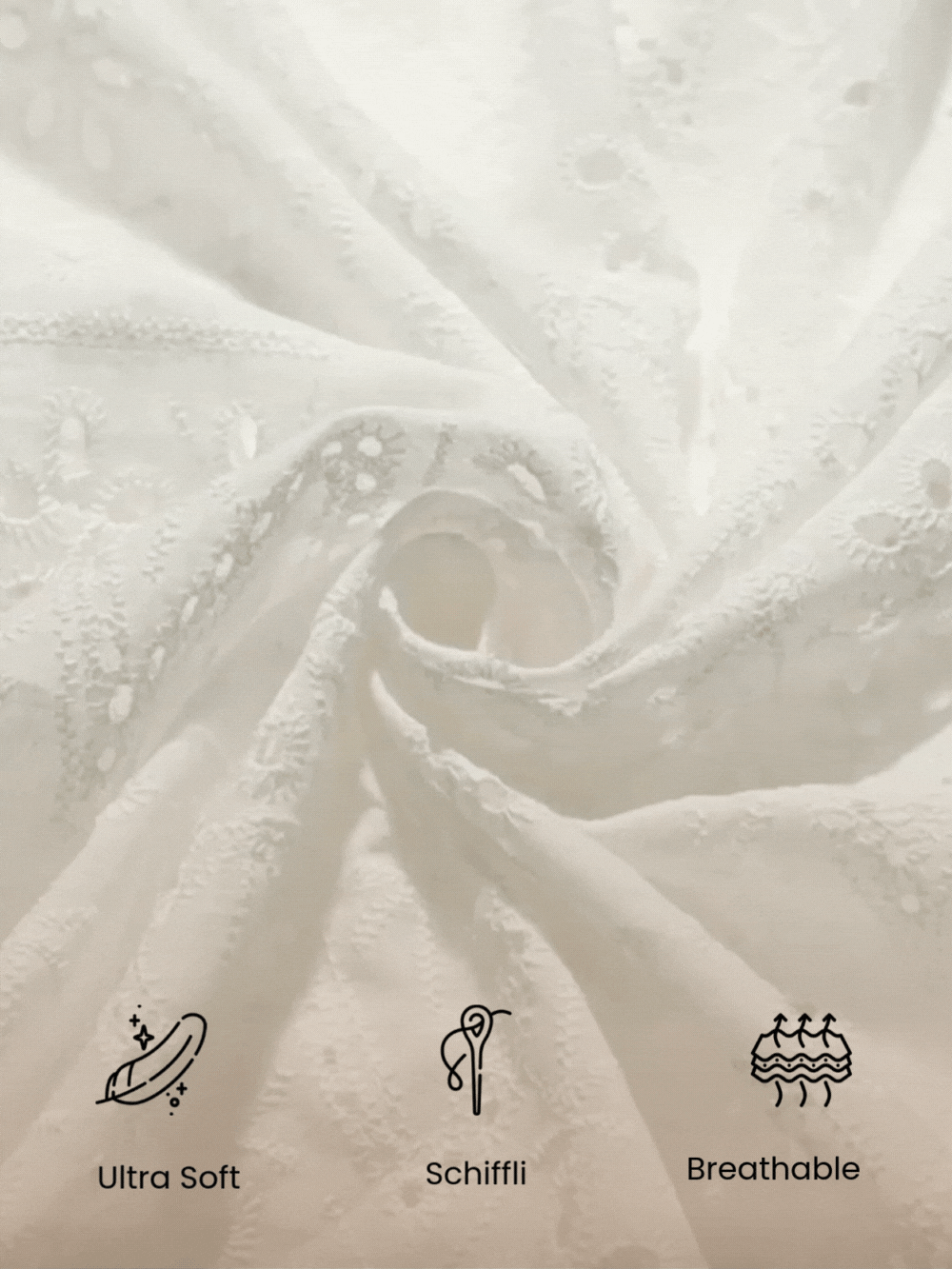 🧵 Embroidery: All-over Schiffli detailing with geometric cutwork