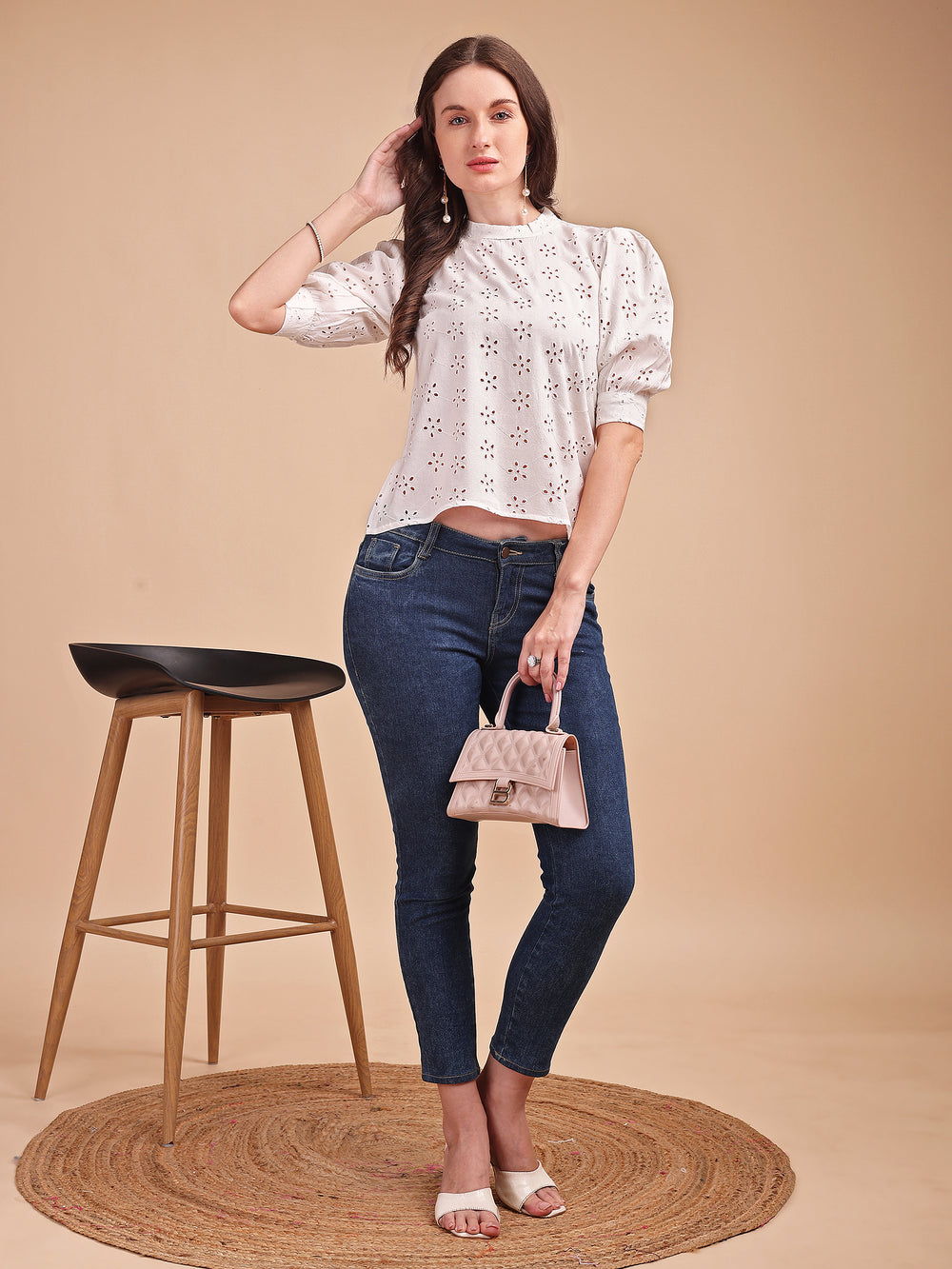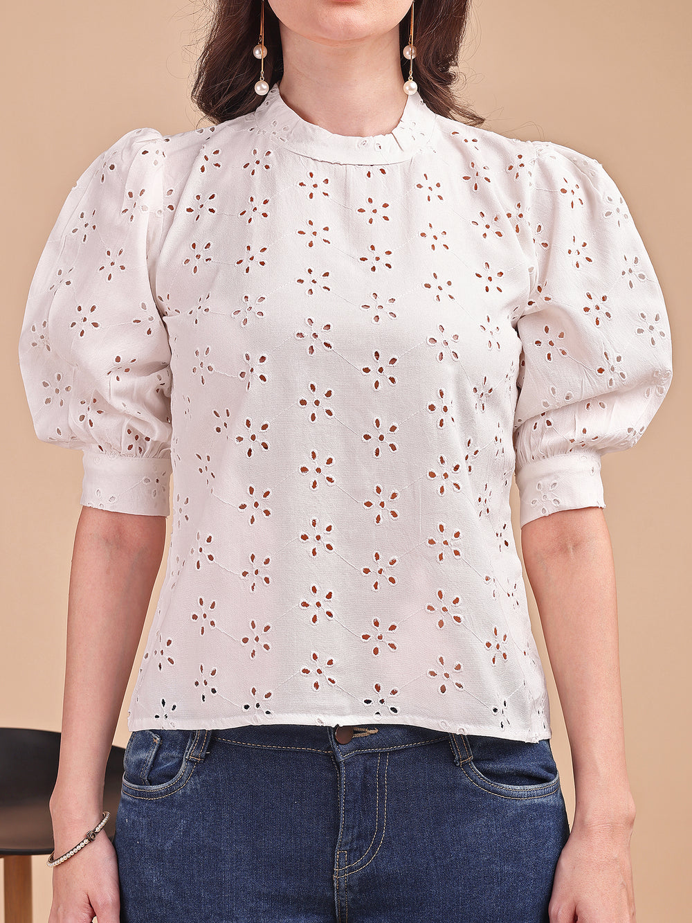Bold sleeves meet delicate detail in the Schiffli Bloom Puff Sleeve Top—a perfect blend of vintage charm and contemporary flair. Crafted from breathable viscose rayon, this top features all-over floral Schiffli embroidery with voluminous puff sleeves and a clean mock neckline for a structured, elegant silhouette.
