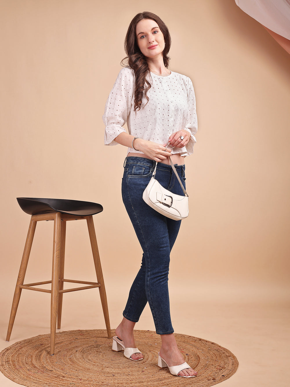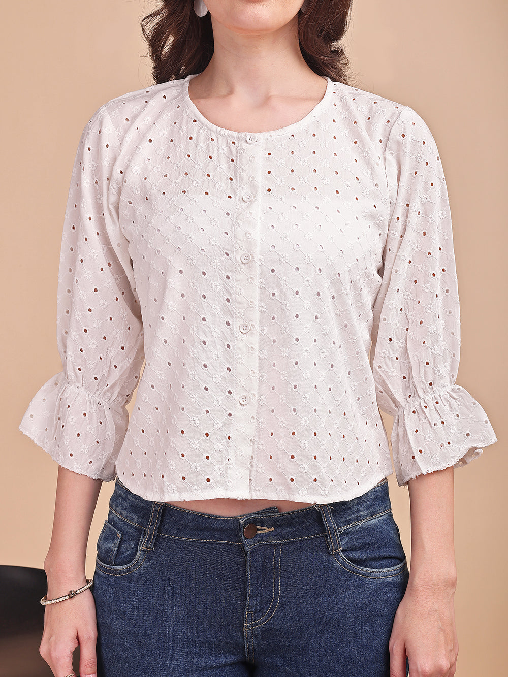 🧵 Embroidery: All-over Schiffli cutwork for textured elegance