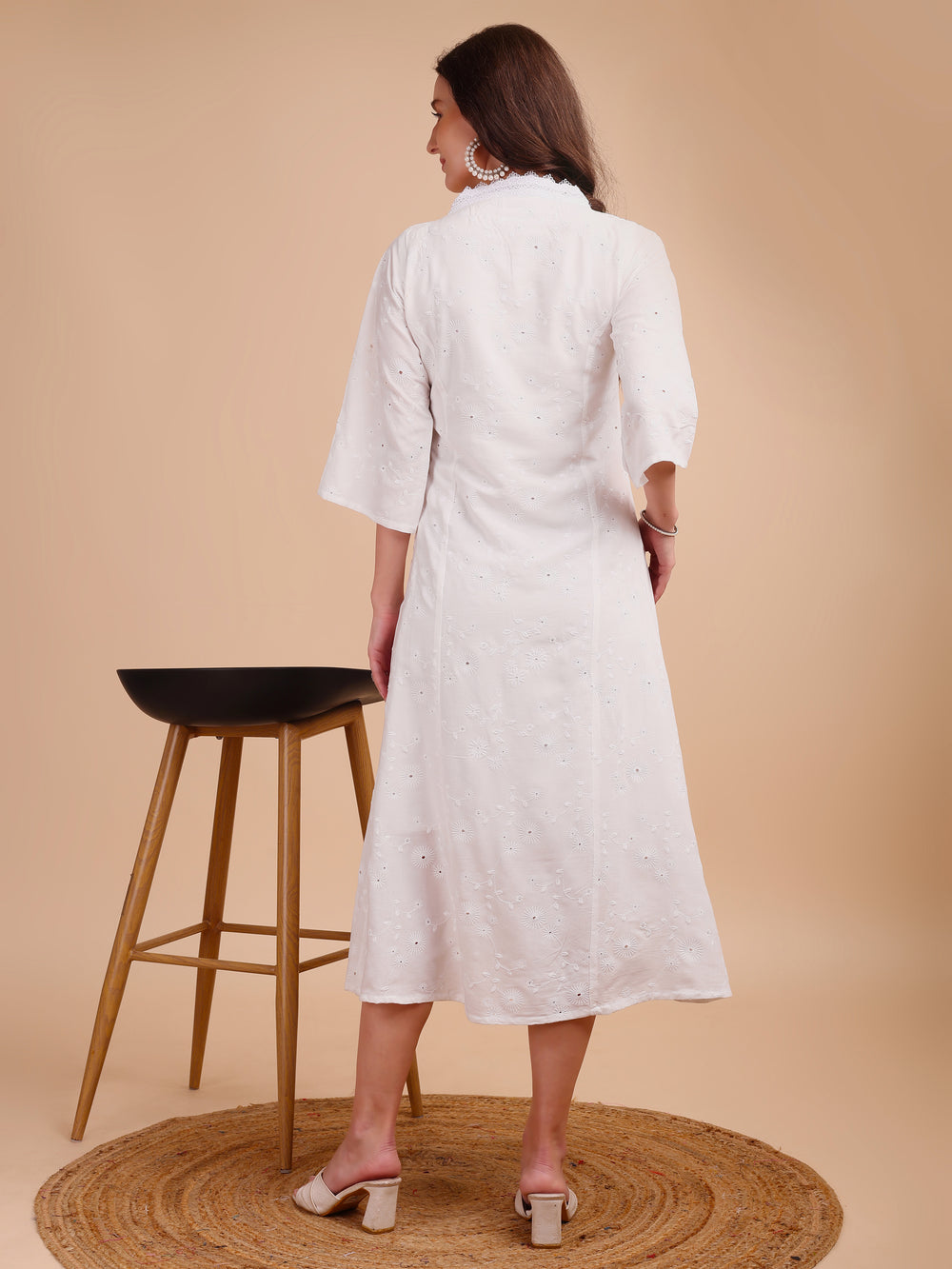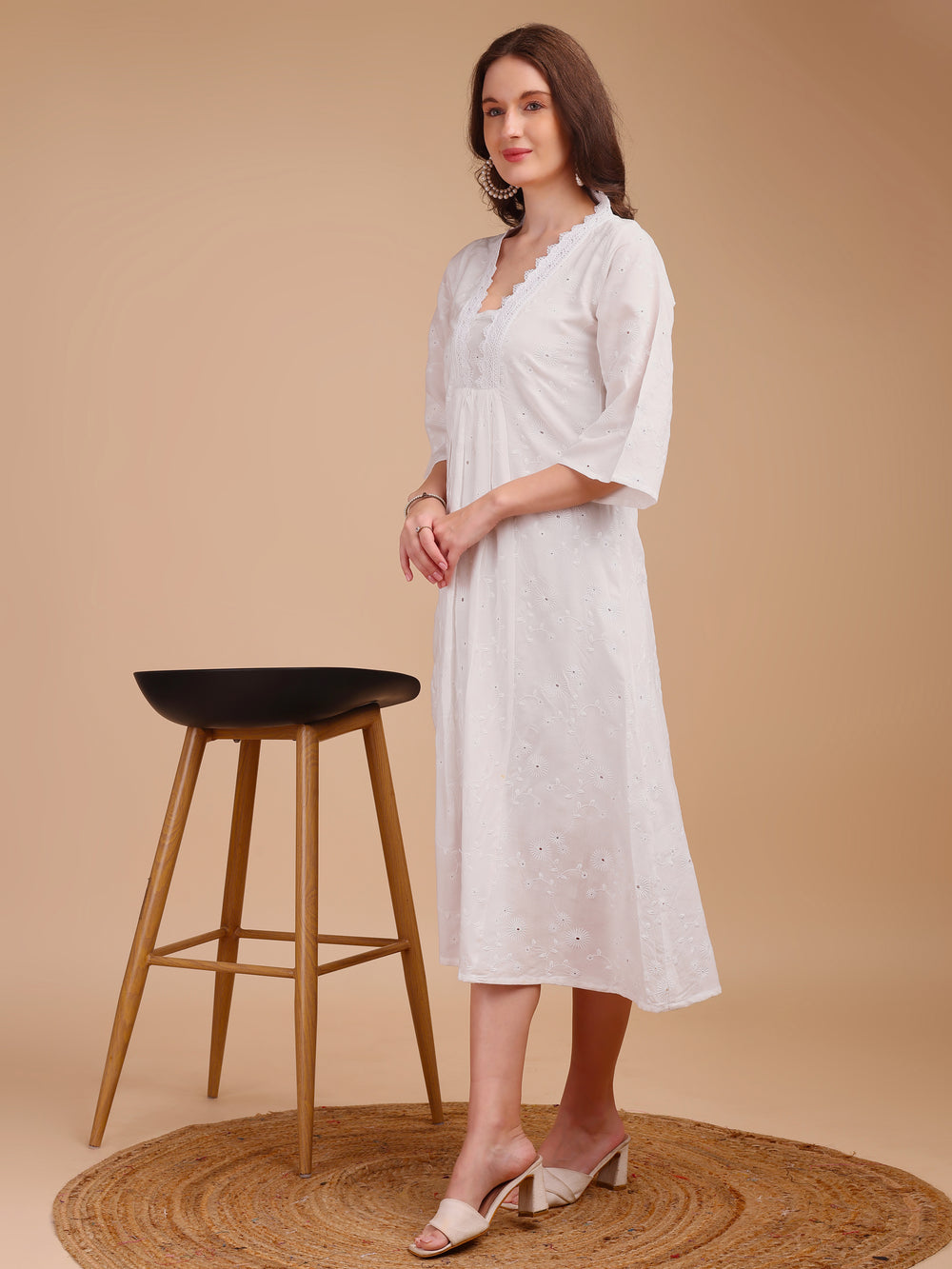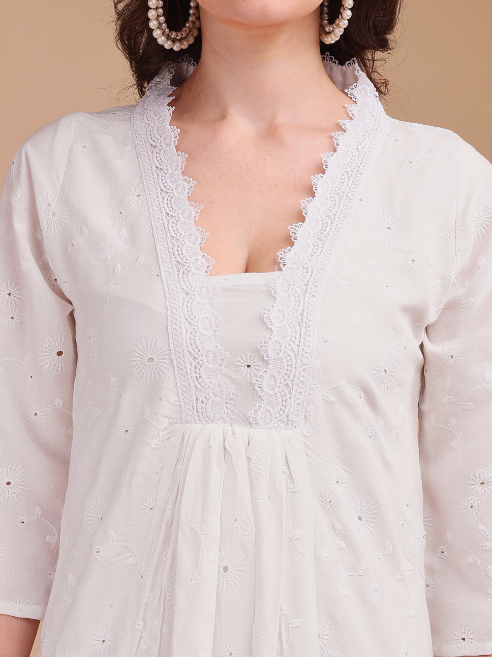Redefine elegance with the Schiffli Grace Fit & Flare Kurti, a beautiful blend of traditional craftsmanship and contemporary style. Made from breathable viscose rayon, this white kurti features all-over Schiffli embroidery, a flattering V-notch neckline with lace detail, and a graceful fit-and-flare silhouette that flows effortlessly with every step.
