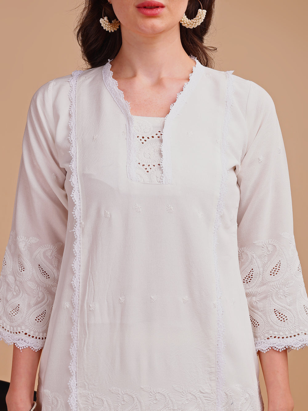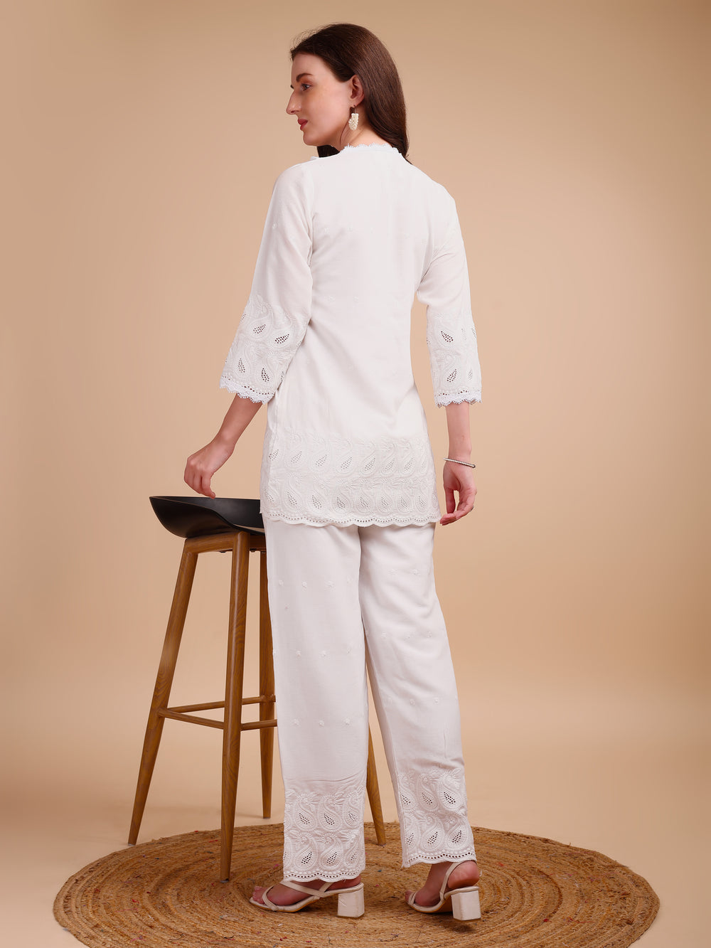 The straight-fit kurta is paired with matching wide-leg pants, both adorned with intricate cutwork that adds soft structure and artisanal texture. Ideal for warm days, relaxed gatherings, or minimalist festive moments.