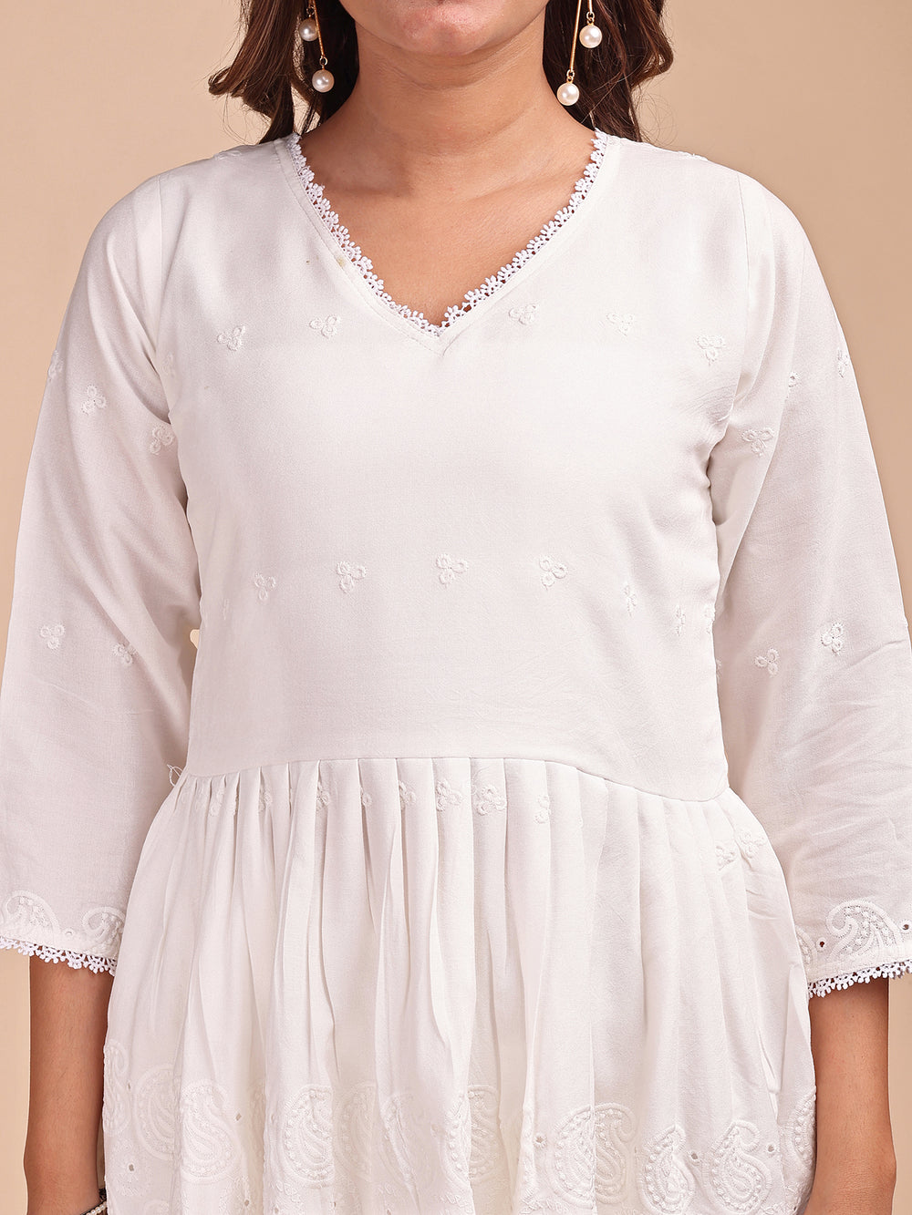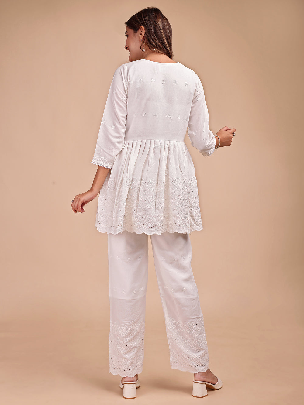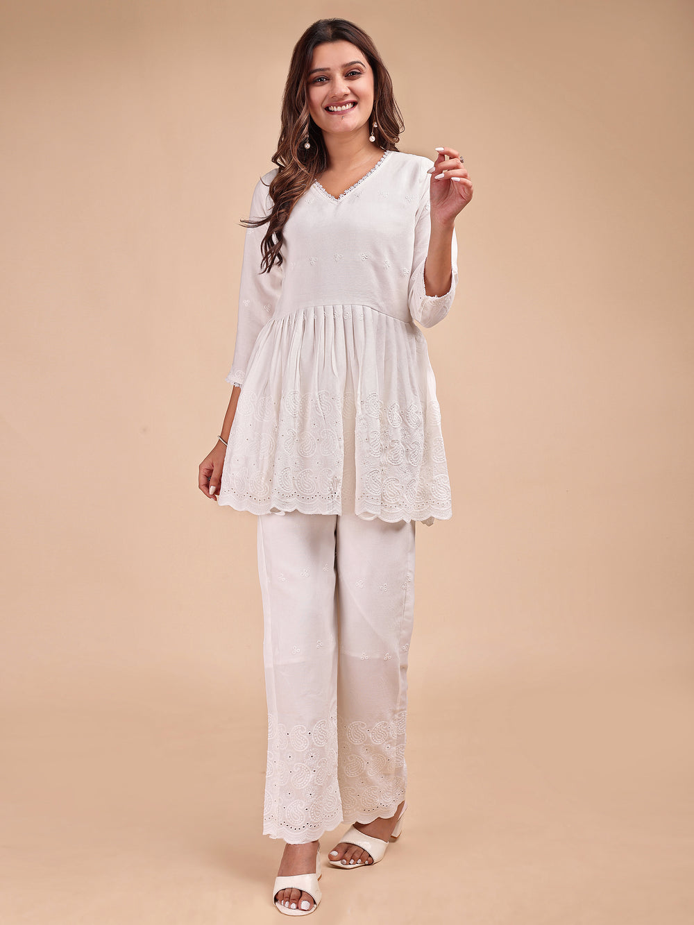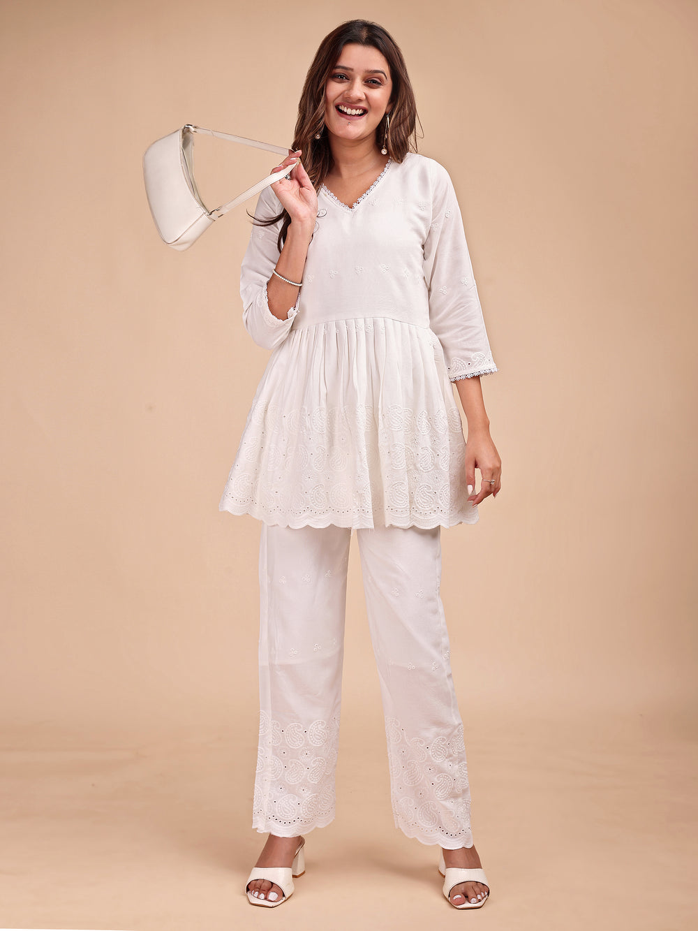 Graceful and effortlessly chic, the Schiffli Notch Peplum Co-ord Set is designed to bring a touch of artisanal elegance to your everyday style. Crafted from breathable viscose rayon, the peplum-style kurta features a flattering notch neckline, 3/4th sleeves, and delicate Schiffli cutwork along the hem for a refined finish.