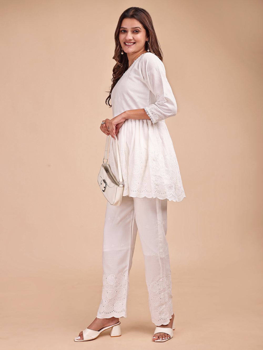 Paired with straight-fit pants adorned with matching cutwork at the cuffs, this set blends comfort with timeless sophistication—perfect for warm days, intimate gatherings, or casual festive wear.