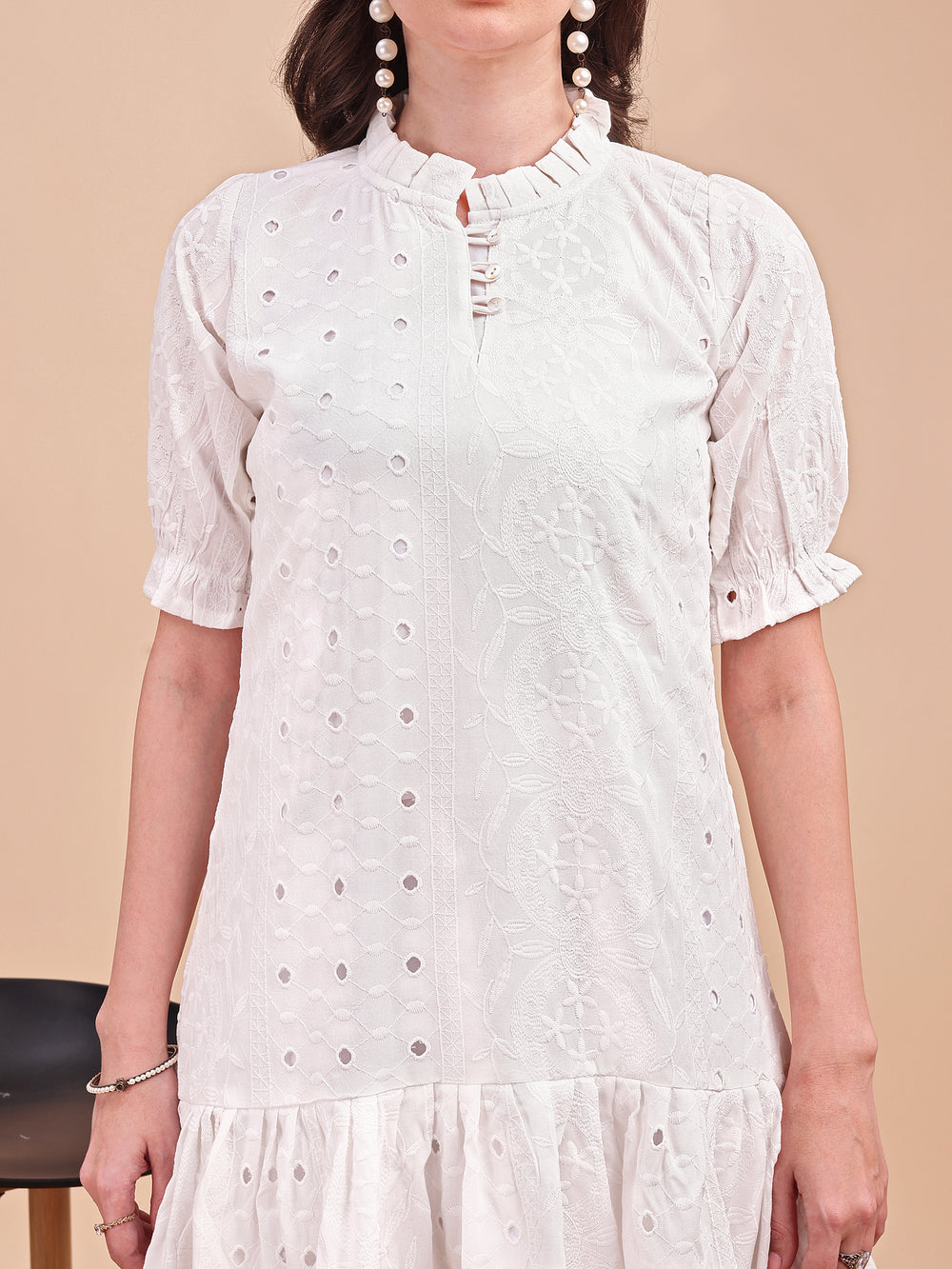 🧵 Embroidery: All-over floral Schiffli cutwork for artisanal texture