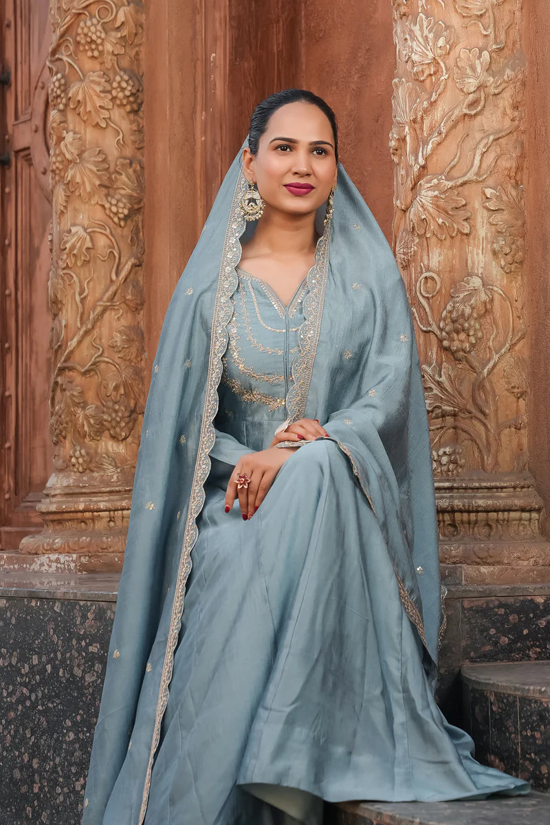 The Embroidered Silk Blend Anarkali Kurta with Dupatta Set features intricate embroidery on a luxurious silk blend fabric. The flattering Anarkali silhouette offers graceful draping, while the matching dupatta complements the look. Ideal for weddings or festive occasions, this set exudes elegance and timeless style.
