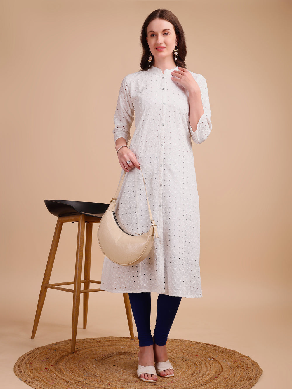 Elevate your everyday style with the White Bloom Schiffli Button-Down Kurti, a graceful blend of comfort and craftsmanship. Made from soft, breathable viscose rayon, this kurti features delicate all-over Schiffli embroidery that adds texture and charm. The elegant mandarin collar, full button-down front, and straight silhouette make it a versatile choice for workwear, casual outings, or festive day looks.